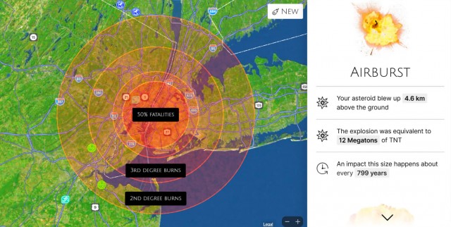 Хотя столкновение не приведет к концу света, ущерб может быть значительным для конкретного района падения. Расчеты показывают, что при ударе в Нью-Йорке он взорвется на высоте 4,5 километра над землей с мощностью, эквивалентной 12 мегатонн тротила. 3,4 миллиона человек погибнут от огненного шара, и почти 7 миллионов человек получат ожоги второй или третьей степени. Здания в радиусе 8,5 километров будут разрушены, и почти все деревья в радиусе 13 километров будут повалены.