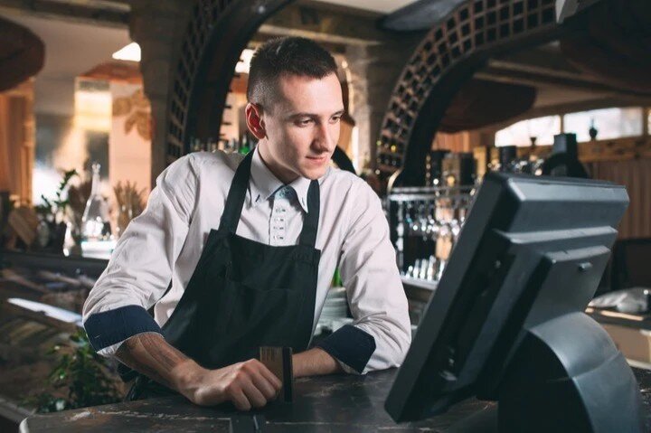 Бармен на контактном баре принимает заказ ЗА НАЛ, готовит его и маякует кассиру.