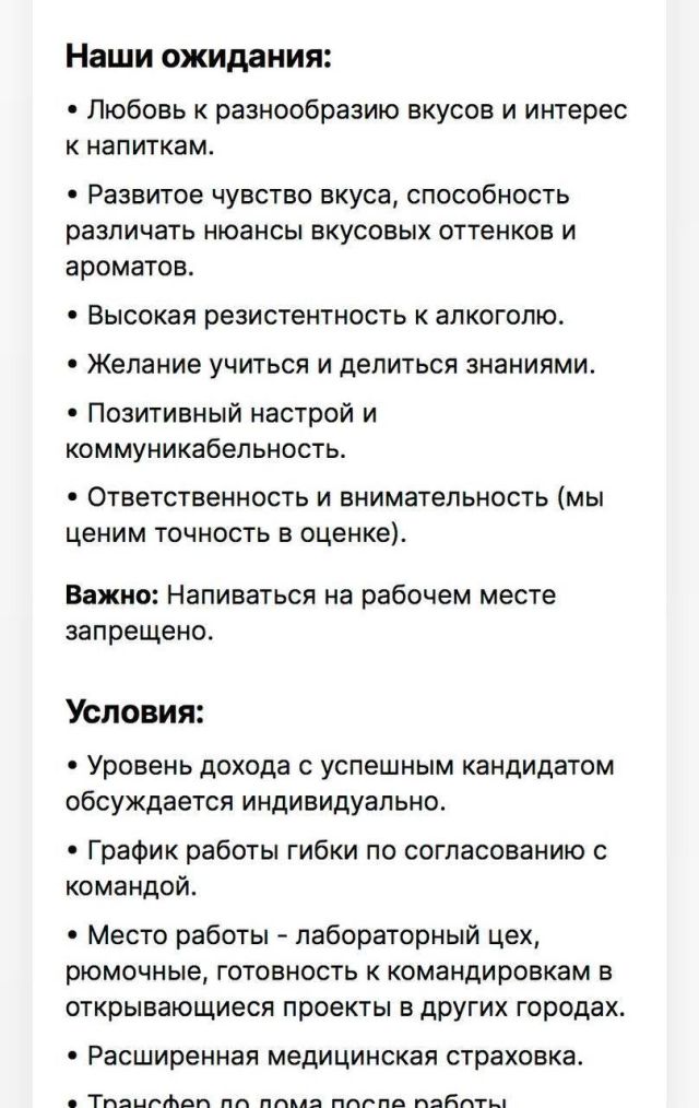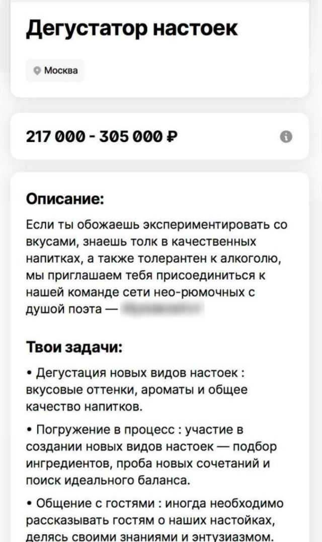 Любите изысканные напитки и обладаете тонким вкусом? В Москве открыта вакансия дегустатора настоек с впечатляющим окладом — 305 тысяч рублей. В обязанности входит тестирование продукции и участие в разработке новых вкусов. Соискателю важно иметь крепкое здоровье и отличную выносливость. Среди бонусов — гибкий график, медицинская страховка и трансфер домой после смены.