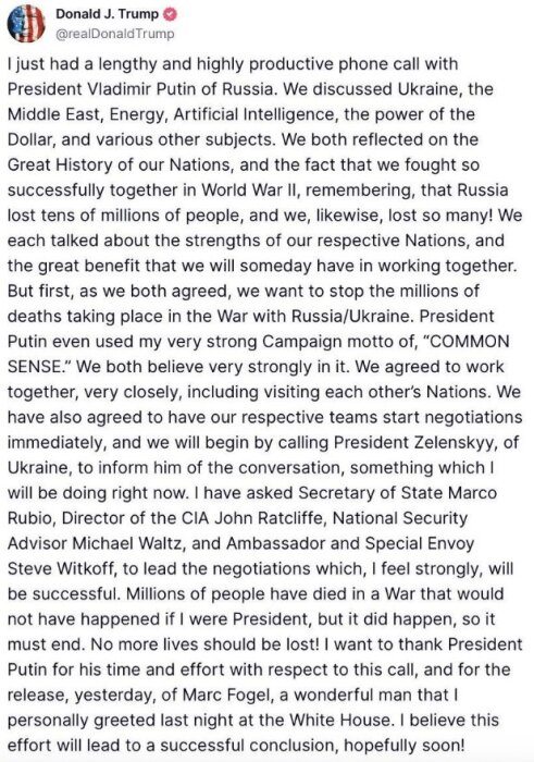 Я только что провел долгий и очень продуктивный телефонный разговор с Президентом Владимиром Путиным из России. Мы обсудили Украину, Ближний Восток, энергетику, искусственный интеллект, мощь доллара и различные другие темы. Мы оба вспомнили о Великой Истории наших Наций и о том, что мы так успешно сражались вместе во Второй мировой войне, помня, что Россия потеряла десятки миллионов людей, и мы тоже потеряли так много! Мы говорили о сильных сторонах наших соответствующих Наций и о великой пользе, которую мы однажды получим, работая вместе. Но сначала, как мы оба согласились, мы хотим остановить миллионы смертей, происходящих в войне России с Украиной. Президент Путин даже использовал мой очень сильный лозунг кампании, "ЗДРАВЫЙ СМЫСЛ". Мы оба очень сильно верим в это. Мы согласились работать вместе, очень тесно, включая визиты в каждую из наших стран. Мы также согласились, что наши соответствующие команды начнут переговоры немедленно, и мы начнем с того, что позвоним Президенту Зеленскому из Украины, чтобы сообщить ему о нашем разговоре, что я сделаю прямо сейчас. Я попросил Государственного секретаря Марко Рубио, директора ЦРУ Джона Рэтклиффа, советника по национальной безопасности Майкла Вальтца и посла и специального посланника Стива Виткоффа возглавить переговоры, которые, я уверен, будут успешными. Миллионы людей погибли в войне, которая бы не случилась, если бы я был Президентом, но она случилась, так что это должно закончиться. Нельзя больше терять жизни! Я хочу поблагодарить Президента Путина за его время и усилия в отношении этого звонка, и за освобождение вчера Марка Фогеля, замечательного человека, которого я лично встретил прошлой ночью в Белом доме. Я верю, что этот шаг приведет к успешному заключению, надеюсь, скоро!