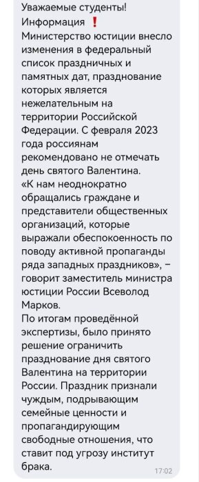 Кстати, в «липовой» публикации говорилось и о том, что празднование 14 февраля запрещено в общественных местах по России и разрешено лишь в частном порядке. Ну это мы так уведомляем. На всякий случай