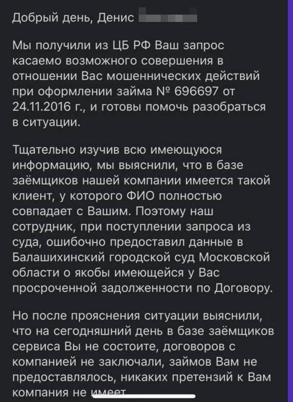 Однако Денис не стал с этим мириться и написал заявление в ЦБ. Тогда и выяснилось, что компания микрозаймов обманула суд: после запроса ЦБ они ответили, что «случайно на суде все перепутали» и никаких займов на самом деле Денис не брал.