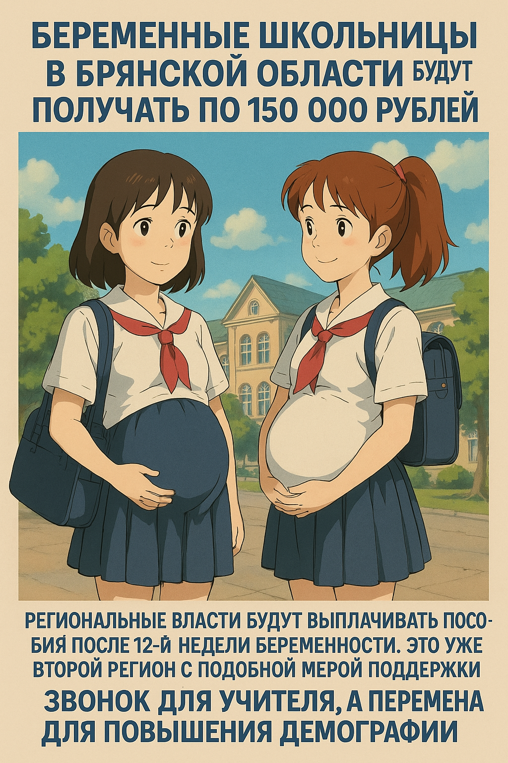 В Брянской области школьницы, ожидающие ребенка, будут получать 150.000 рублей 30/03/2025 17:00 Власти региона начнут выплачивать пособия с 12-й недели беременности. Это второй регион, внедривший такую поддержку.Звонок для педагогов, а перемена для увеличения рождаемости.via Главная / Статьи -7 Admin 2 106