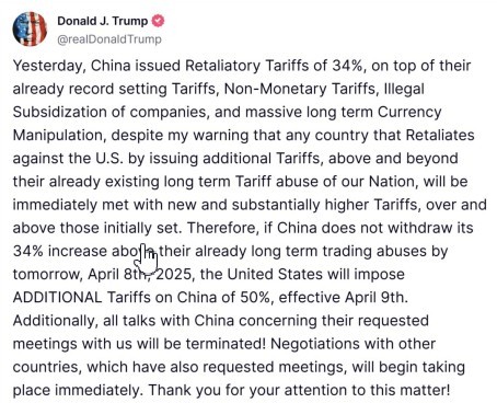 🇺🇸💣 Трамп снова на движах: пошлины или ничего! 08/04/2025 11:00 Трамп в ультимативном настроении: если Китай не скинет пошлины до 8 апреля, то уже с 9-го Америка врубает свои — и не абы какие, а 50%! 😳Ждём жёсткий экономический баттл Главная / Статьи +1 Admin 0 116