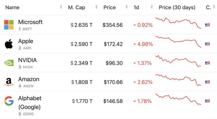 Не потому, что она взлетела вверх, а потому, что не падает так сильно, как остальные. После действий Трампа, которые потрясли мировые финансовые рынки, капитализация многих компаний пошла вниз. Так вот, Apple за последний день потеряла почти 5% стоимости акций, а Microsoft всего 1%. В итоге, капитализация Microsoft сейчас составляет $2,63 трлн, а у Apple — $2,59 трлн. 📉