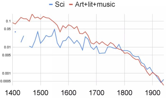 График заканчивается на 1950 году. Синим — количество признанных ученых, красным — художников, разделенное на эффективное население (общее количество людей, имеющих образование и доступ, чтобы внести вклад в эти области).