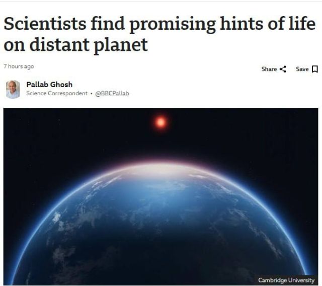 Учёные из Кембриджа с помощью телескопа Джеймса Уэбба обнаружили в атмосфере планеты K2-18b молекулы диметилсульфида и диметилдисульфида, которые на Земле производятся живыми организмами. И это не просто пара молекул, а очень высокая концентрация — в тысячи раз выше, чем на нашей планете. Значит там действительно может быть жизнь. K2-18b находится на расстоянии 120 световых лет от Земли, и на сегодняшний день ни одна другая планета не показывала настолько точного наличия признаков жизни за всю историю наблюдений. Вероятность того, что это не ошибка, — 99,7%!