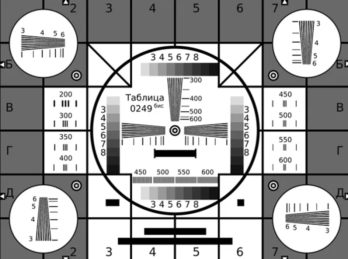- Большой круг в центре картинки необходим для контроля геометрических искажений растра.