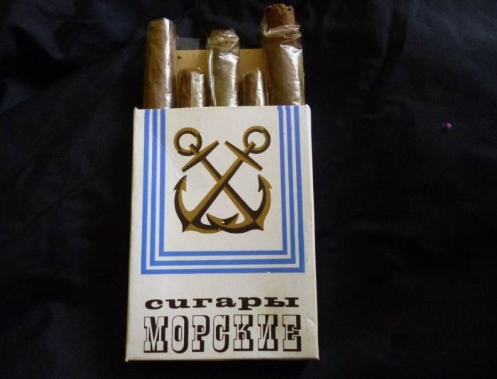 Кто-то из вас хотя бы раз пробовал сигары под названием "Морские"? Продавались в обычной картонной коробке, в которой находилось 5 небольших, толстеньких сигар. На пачке нарисовано два скрещенных якоря. За одну пачку курильщик платил всего 45 копеек. Выходит, каждая сигара поштучно стоила 9 копеек. Не слишком дорого.