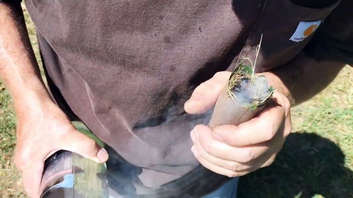 Берем бутылку (кстати пластиковая тоже годится) и заполняем ее чистой водой. Затем как линзой лупу ловим солнечный свет, пытаясь сфокусировать концентрированную световую точку на сухой траве. Это нужно делать в районе горлышка, так как оно имеет округлую форму.