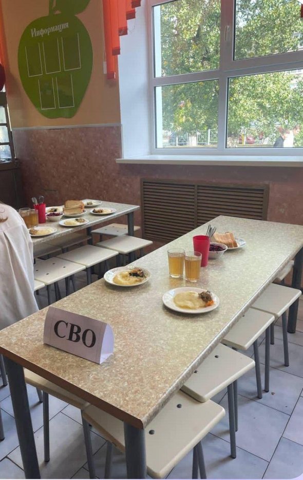 В школьных столовых Азова (Ростовская область) появились таблички, которые определяют, кто где обедает — “дети из малоимущих семей” отдельно, а “дети участников СВО” — за другими столами.