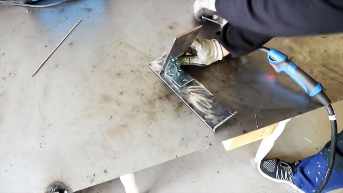 Поперечная линия соприкосновения 20-сантиметровой полосы и основания будет местом расположения оси вращения петли. Прихватываем сваркой одну ее половину к основанию, а другую – к 20-сантиметровой полосе.