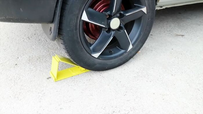 Испытываем тормозной башмак в деле. Устанавливаем его в рабочее положение позади колеса и осторожно сдаем назад. Колесо вначале наезжает на «язычок» основания и прижимает его к дороге и только затем упирается в наклонный элемент упора.