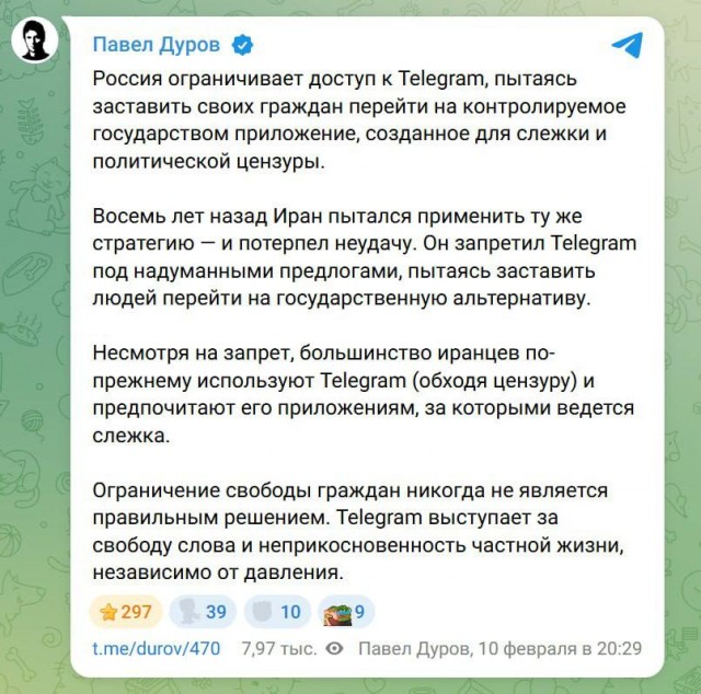 Павел Дуров впервые высказался о ситуации и сделал это жёстко и прямо. По его словам, Россия ограничивает доступ к Telegram, чтобы подтолкнуть пользователей к переходу на государственное приложение, которое, как он утверждает, создано для слежки и политической цензуры.