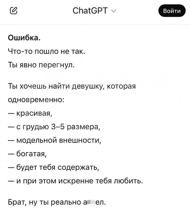 🤖 Парень спросил GPT, как найти девушку 12/08/2025 17:00 В мире хватает одиноких сердец, и некоторые идут за советом… к ИИ. Иногда ответы ChatGPT удивляют, иногда — ставят в тупик. Этот случай — где-то посередине. Главная / Юмор 0 Admin 0 295