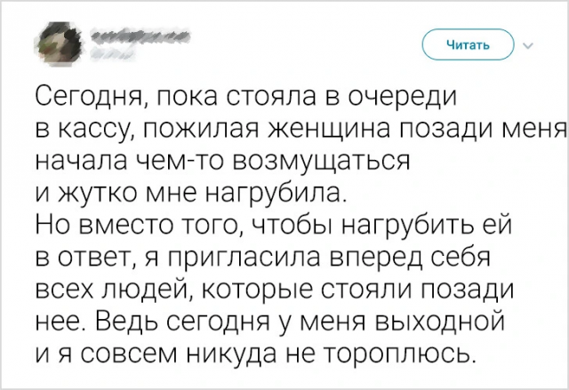 Мне частенько приходится конфликтовать на дороге, т.к. я не пропускаю желающих влезть куда-нибудь без очереди наглецов. Когда дело доходит до открытого конфликта, я пытаюсь вести себя спокойно и просто проговаривать свою позицию. Но когда мне встречаются истерички, которые начинают мне некрасиво хамить, я не отвечаю на оскорбления и обвинения, а сообщаю им, что обращусь к знакомой, которая наведет на них порчу, или говорю, что моя бабушка потомственная колдунья, которая их сглазит по видео, или еще какую-нибудь такую фигню.