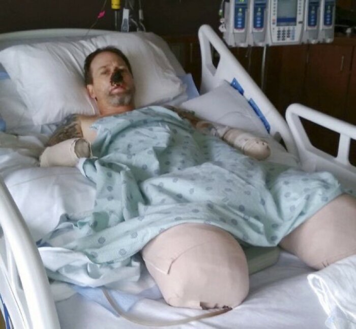 Это Грег Мантейфель, который теперь очень жалеет, что как-то по дороге домой решил погладить бездомного пса, который выглядел дружелюбно. Пёс цапнул мужчину, ничего особенного, однако через несколько дней у Грега сильно поднялась температура и начали неметь конечности. Он обратился к врачу.