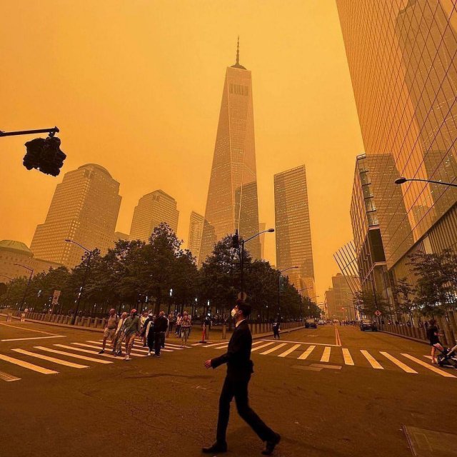 В Нью-Йорке сегодня официально худший день по качеству воздуха почти за 25 лет. Синоптики сделал особую отметку «опасно для жизни» и призвали оставаться дома. Кадры выглядят будто апокалипсис.
