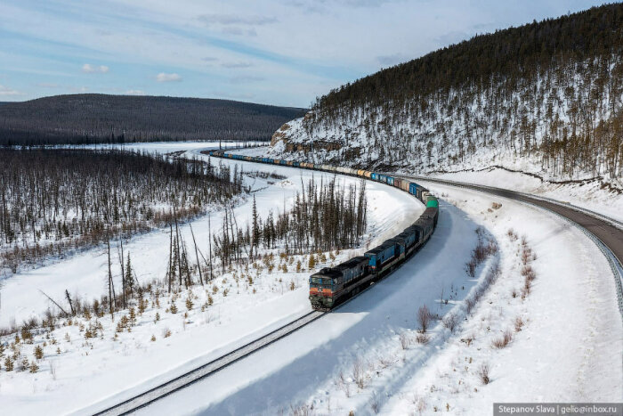 С транспортом в Якутии сложно. Во-первых, это самый большой регион России, да и в мире стоит на первом месте среди других административно-территориальных единиц. Площадь Якутии более 3 млн км². На такой огромной территории поместилась бы Индия или 12 Великобританий. Во-вторых, большая часть местности — горы и плоскогорья, только 1/3 площади занимают низменности и равнины. В регионе около 1,5 млн ручьёв, озёр и рек. Весной водоёмы выходят из берегов, разливаются. В течение года разница температур достигает 75° — от -50…-65°C зимой до +15…+25°C. Летом крупные реки используются для судоходства, когда наступают морозы — прокладывают зимники. В Якутии развита и авиация, но доставлять грузы самолётами слишком дорого. Идеальный транспорт для таких условий — железнодорожный.