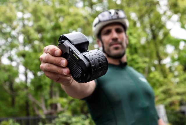 Устройство просто устанавливается на раму и может вращать заднее колесо со скоростью до 32 км/ч, а аккумулятор, скрытый под формой бутылки с водой, обеспечивает запас хода до 90 км. Электромотор можно легко отключить с помощью кнопки на ручке, после чего он поднимется над шиной и не будет создавать неудобств.