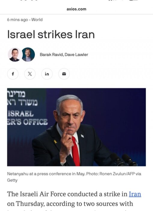 Согласно сообщениям, израильские силы начали атаку на Иран. В Тегеране слышны взрывы и работа ПВО. К тому же, Израиль закрыл своё воздушное пространство по всей территории. Ситуация развивается быстро.