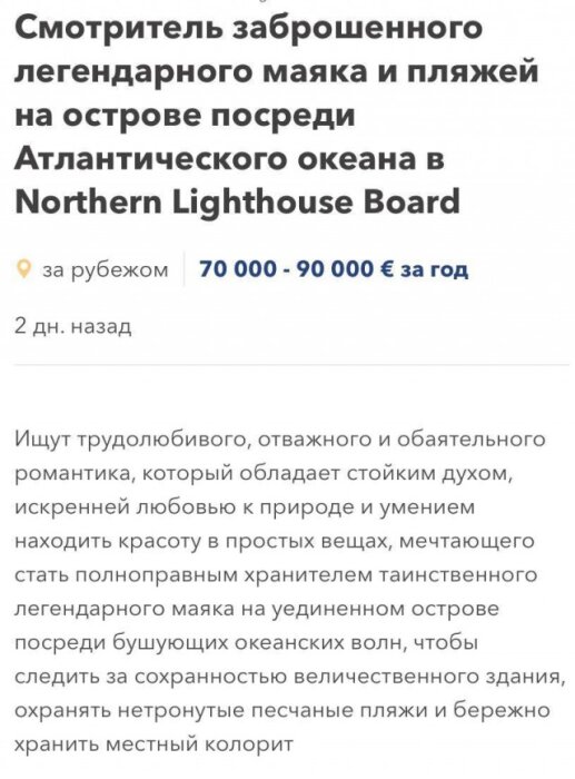Шотландия в поисках настоящего романтика и трудолюбивого человека, который будет ухаживать за маяком. Заработная плата — 8,1 млн рублей в год (~660 тыс. рублей в месяц).