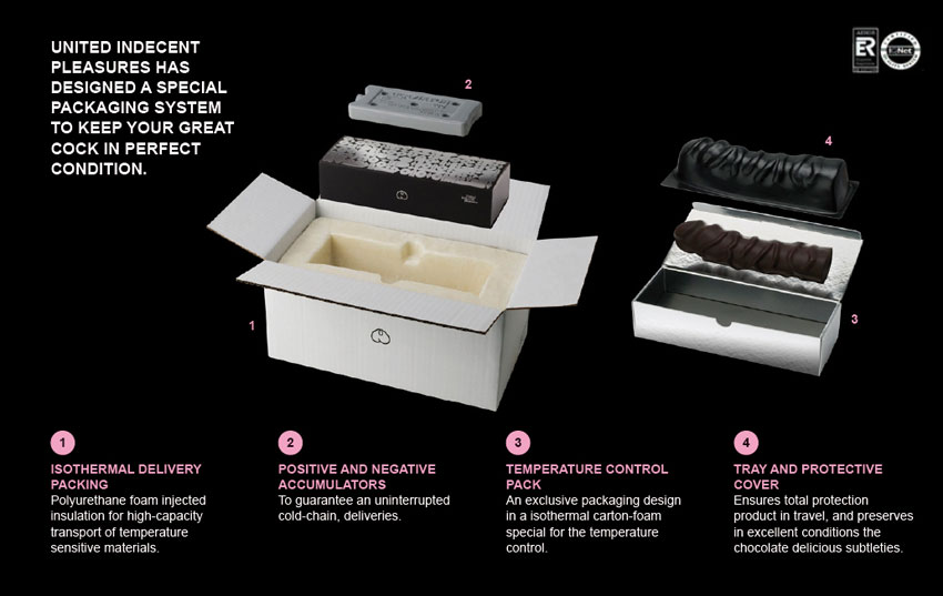 А вот и упаковка. Она изотермическая, чтобы шокочлен вдруг не растаял. Есть специальная компактная холодильная установка и две небольших батареи. Плюс шокочлен помещен в специальный чехол, который, в свою очередь, лежит в защитной коробочке из металла. Таким образом, конфетка упакована тщательнее, чем смерть Кощея!