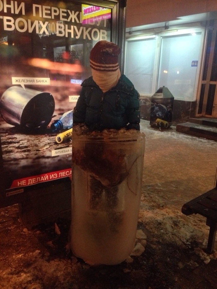 На нескольких красноярских остановках стоят замерзшие люди. Они закутаны в шарфы, на головах теплые шапки, куртки плотно застегнуты, а ноги вмерзли в тумбы из огромных кусков льда.