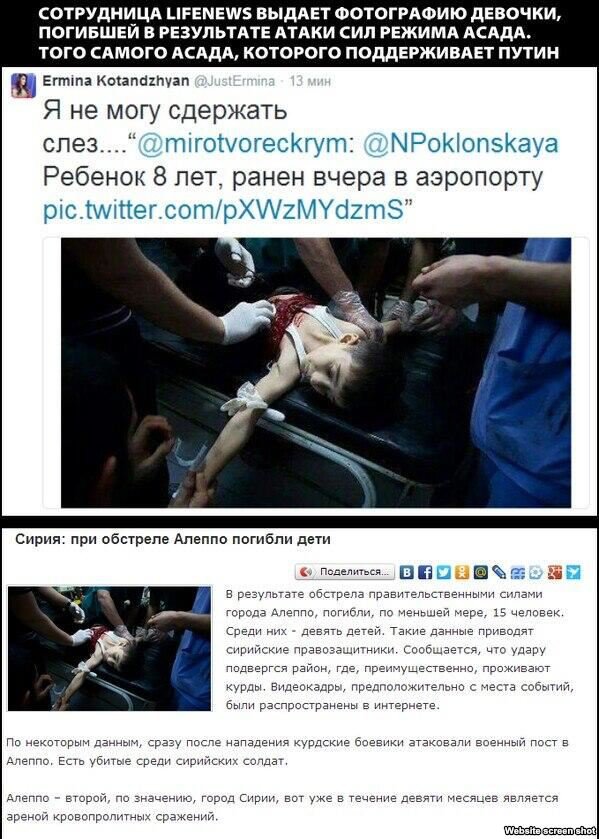 Ну и широко известный случай с сирийской девочкой от журналистки главного телеканала фальсификаций LifeNews.