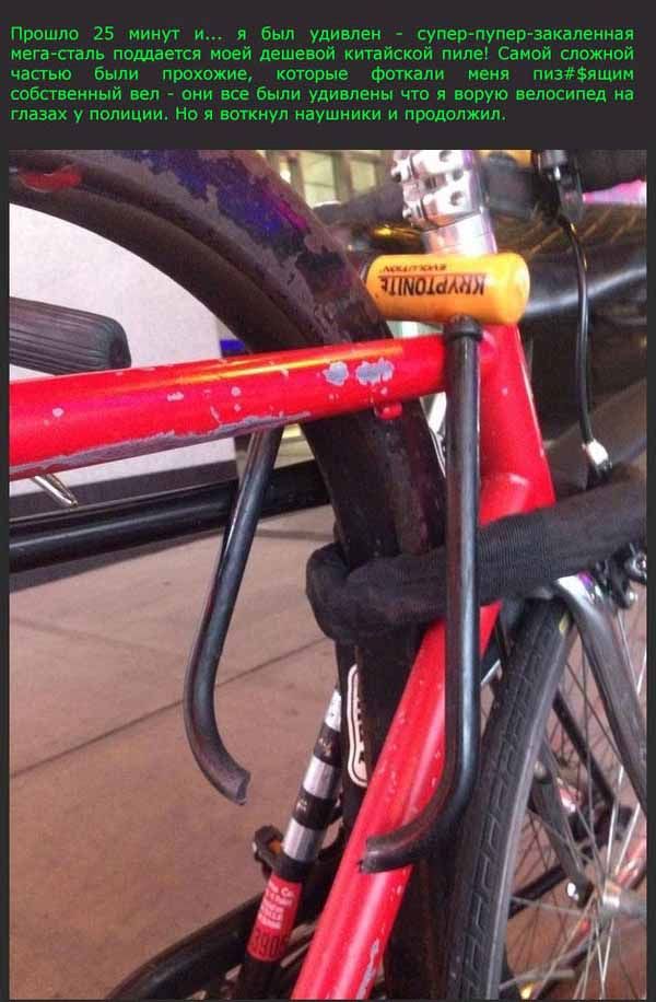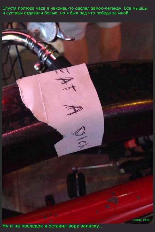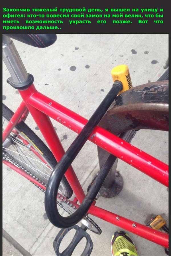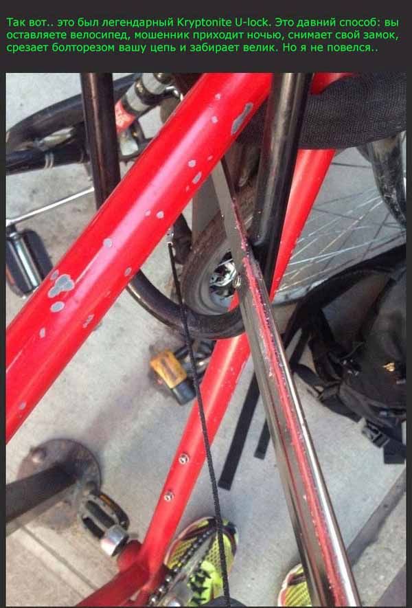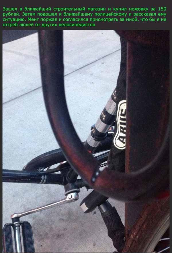 Неудачная попытка украсть велосипед 30/07/2014 23:24 Довольно необычным способом воровства велосипедов решил поделиться с нами автор снимков продолжении поста. Даже если вы тоже когда-то попадете в подобную ситуацию, главное - не паниковать и "не бросать" свой велосипед в беде Главная / Картинки +17 Admin 10 2 653
