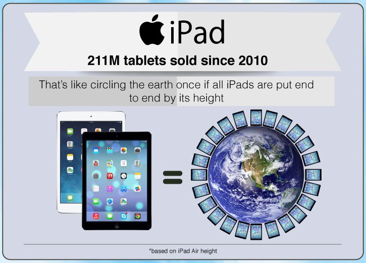 С 2010 года раскуплено 211 миллионов планшетов Apple. Сложив их рядом длинной стороной друг к другу, можно опоясать всю Землю.
