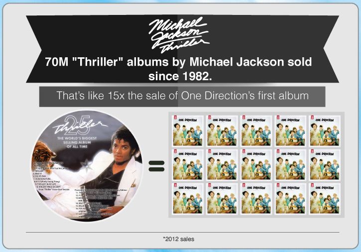 С 1982 года продано 70 миллионов копий. Это в 15 раз больше, чем ошеломительные продажи дебютного альбома One Direction, благодаря которому эта группа стала суперпопулярной в мире.