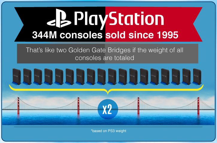 С 1995 года продано 344 миллиона игровых консолей. По весу это как два моста Золотые Ворота в Сан-Франциско. А ведь это знаменитое сооружение много лет считалось самым большим висячим мостом в мире.