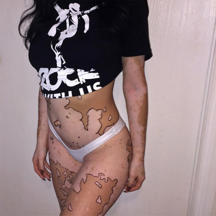 В 12 лет у Эшли Сото (Ashley Soto) из Орландо, США, была диагностирована болезнь, затрагивающая всего 1% населения планеты — витилого. Всё началось с белого пятна на её шее, но в течение года болезнь распространилась на 75% площади её тела, оставшейся без пигмента. Не трудно догадаться, как тяжело девушке-подростку жилось со своей болезнью. Она постоянно подвергалась издевательствам со стороны сверстников, поэтому ей постоянно приходилось прятать свою кожу за длинными рукавами и свитерами с горлом. Сейчас Эшли 21 и она научилась любить свою кожу такой, какая она у неё есть. Обводя оставшиеся участки кожи с меланином различными цветными линиями, Эшли превратила свою болезнь в искусство.