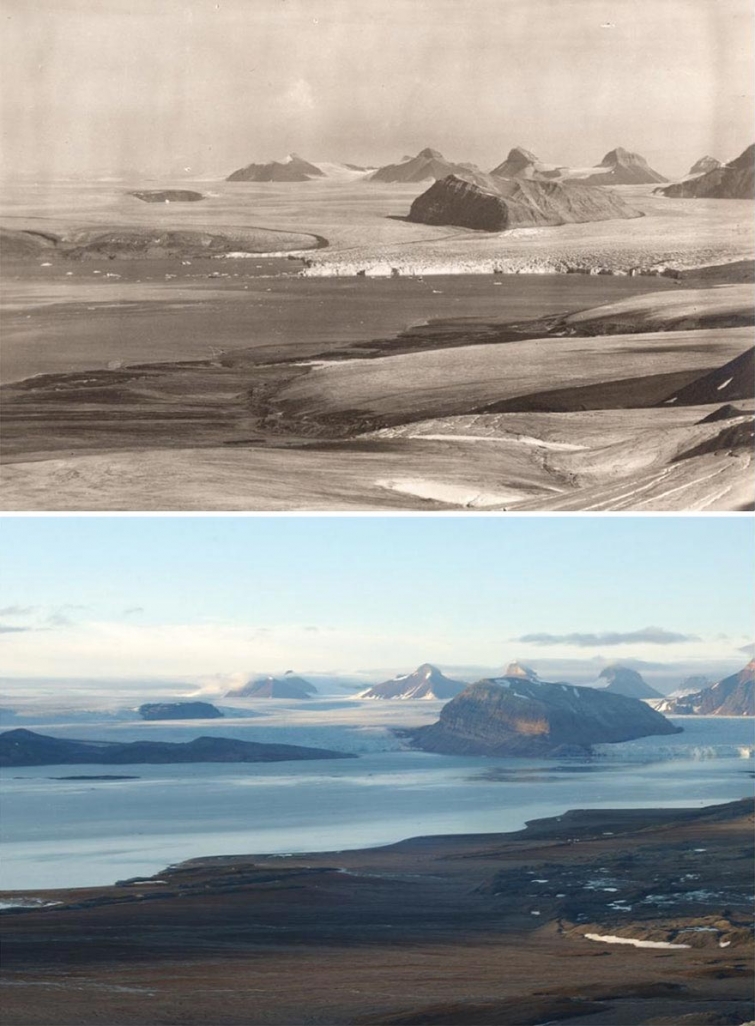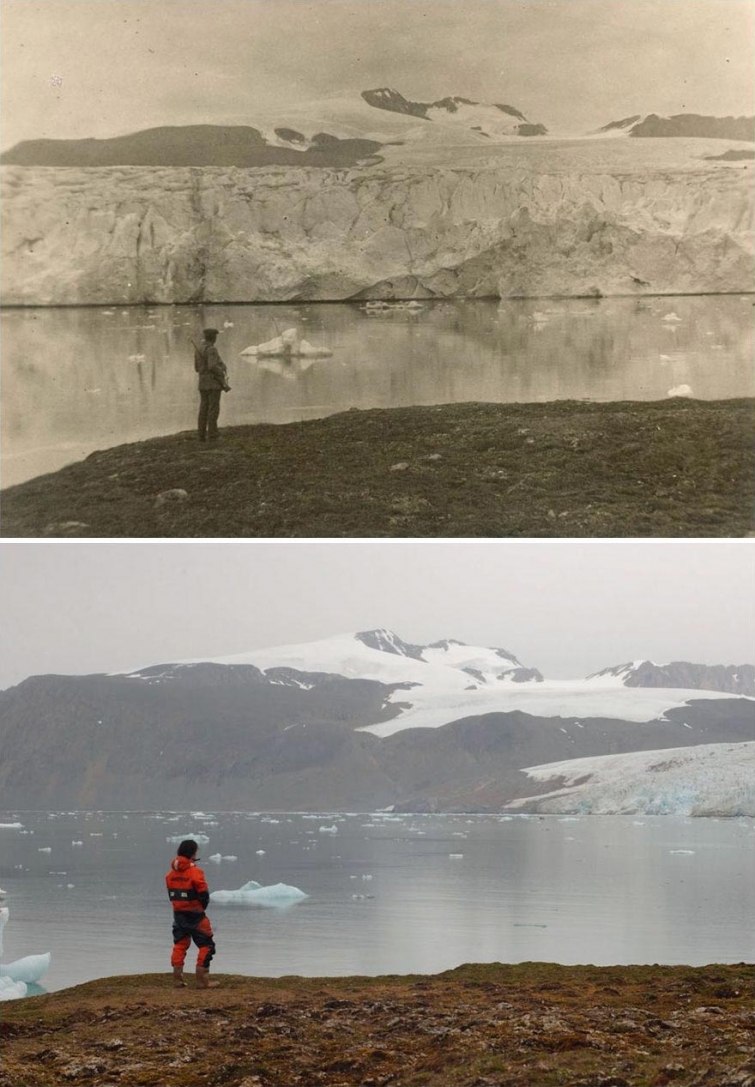 Шведский корреспондент Кристиан Аслунд (Christian Åslund) работающий с Greenpeace собрал ранние фотографии ледников в Свальбард, Норвегия, позаимствованные им из Норвежского полярного института и сравнил их с теми фотографиями, которые он сделал в тех же местах, только в 2002 году. Различия просто шокируют.