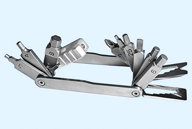 Это приспособление легко умещается на ладони и содержит в себе целых 15 инструментов: плоскую и крестовую отвертки, комплект шестигранных ключей, ключ-звездочку Т25, комплект гаечных ключей, гвоздодер, монтировку и фонарик.