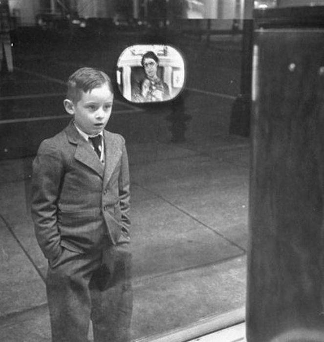 Мальчик впервые смотрит телевизор через витрину магазина, 1948 год