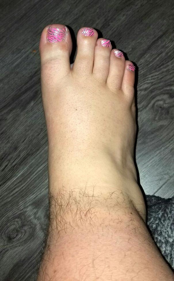 "Мой муж поспорил со мной, что я не смогу побрить его ноги, пока он будет спать. Это то, что он увидел, проснувшись утром"