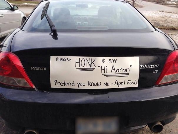 "Пожалуйста, посигнальте и скажите 'Привет Аарон', типа вы меня знаете" — первоапрельский розыгрыш, который устроила моя сестра своему мужу
