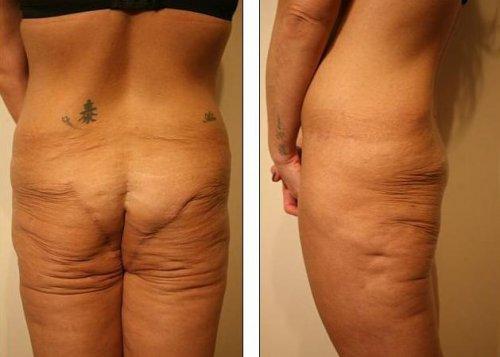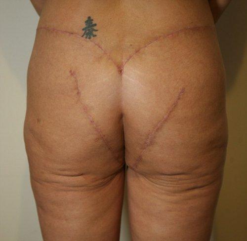 После неудачной пластической операции ягодицы этой женщины выглядели так, будто их пыталась откусить акула. Хирурги удалили оттуда слишком много жира, после чего на ягодицах остались огромные диагональные шрамы.