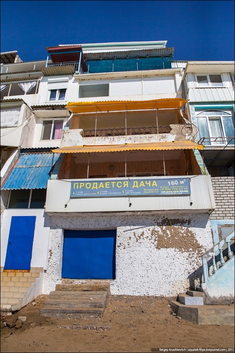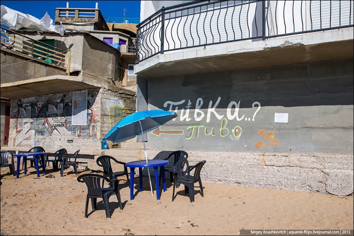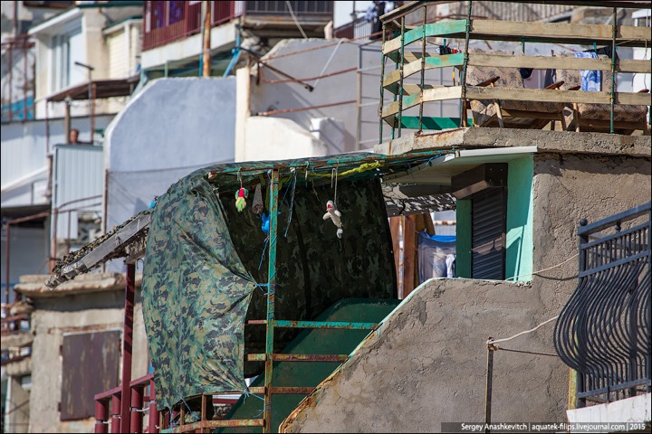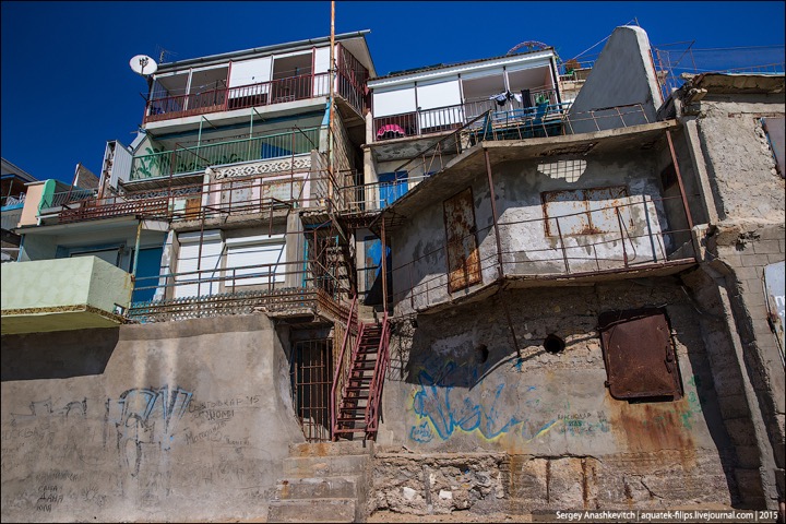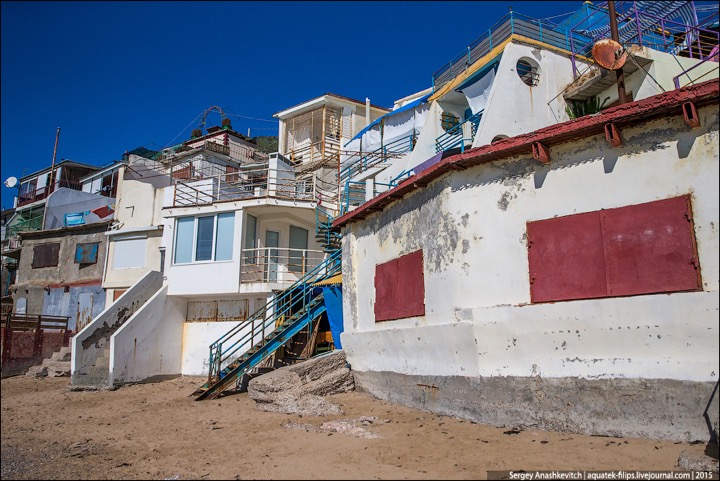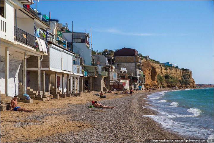 Наткнулись в ЖЖ aquatek-filips на интересные фотографии. Речь в заметке идет о том, что в Крыму власти наконец нашли в себе силы снести так называемые "Матросские дачи" под Севастополем. А по факты эти дачи – жуткого вида капитальные халупы, построенные в 5-10 метрах от линии прибоя. И все эте помещения сдаются отдыхающим в сезон как элитное жилье. Элитность номеров не в том, что в ведро ходить надо, а в том, что открыл стальную дверь – и ты уже на пляже. Стоимость аренды – $30-50 в сутки. Желающих было хоть отбавляй. Но в этом сезоне про бизнес придется забыть – туда уже выезжают экскаваторы...