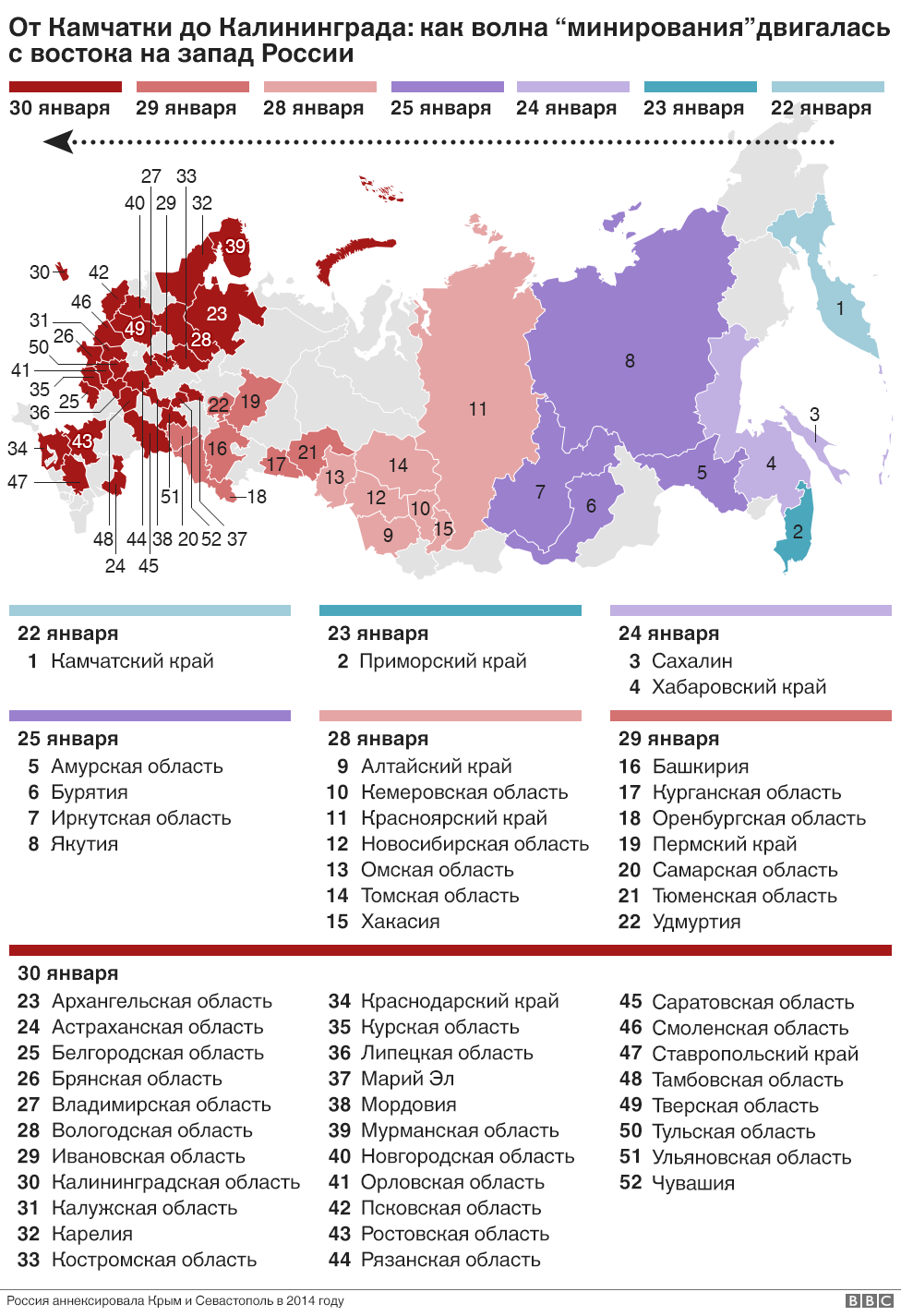 Волна "минирований" прокатилась с востока до запада России. Показываем на карте