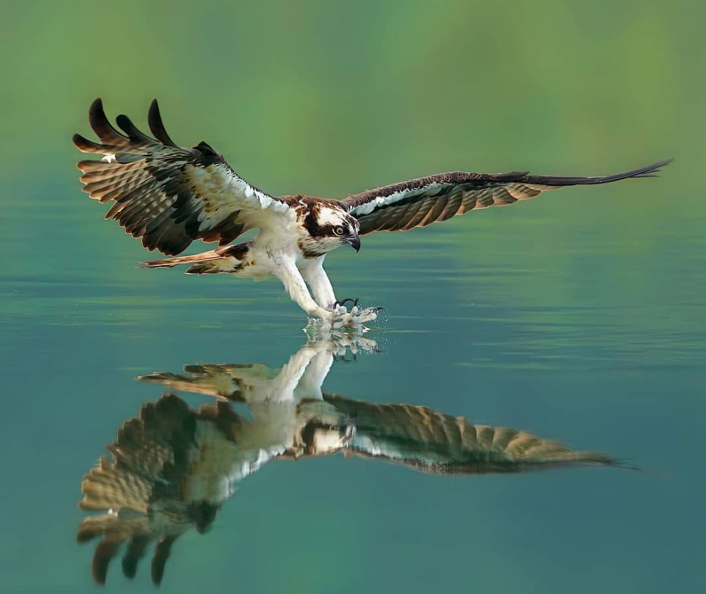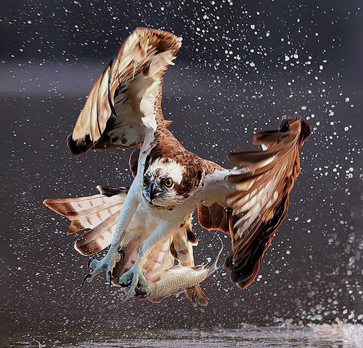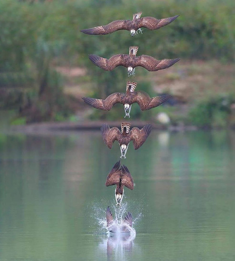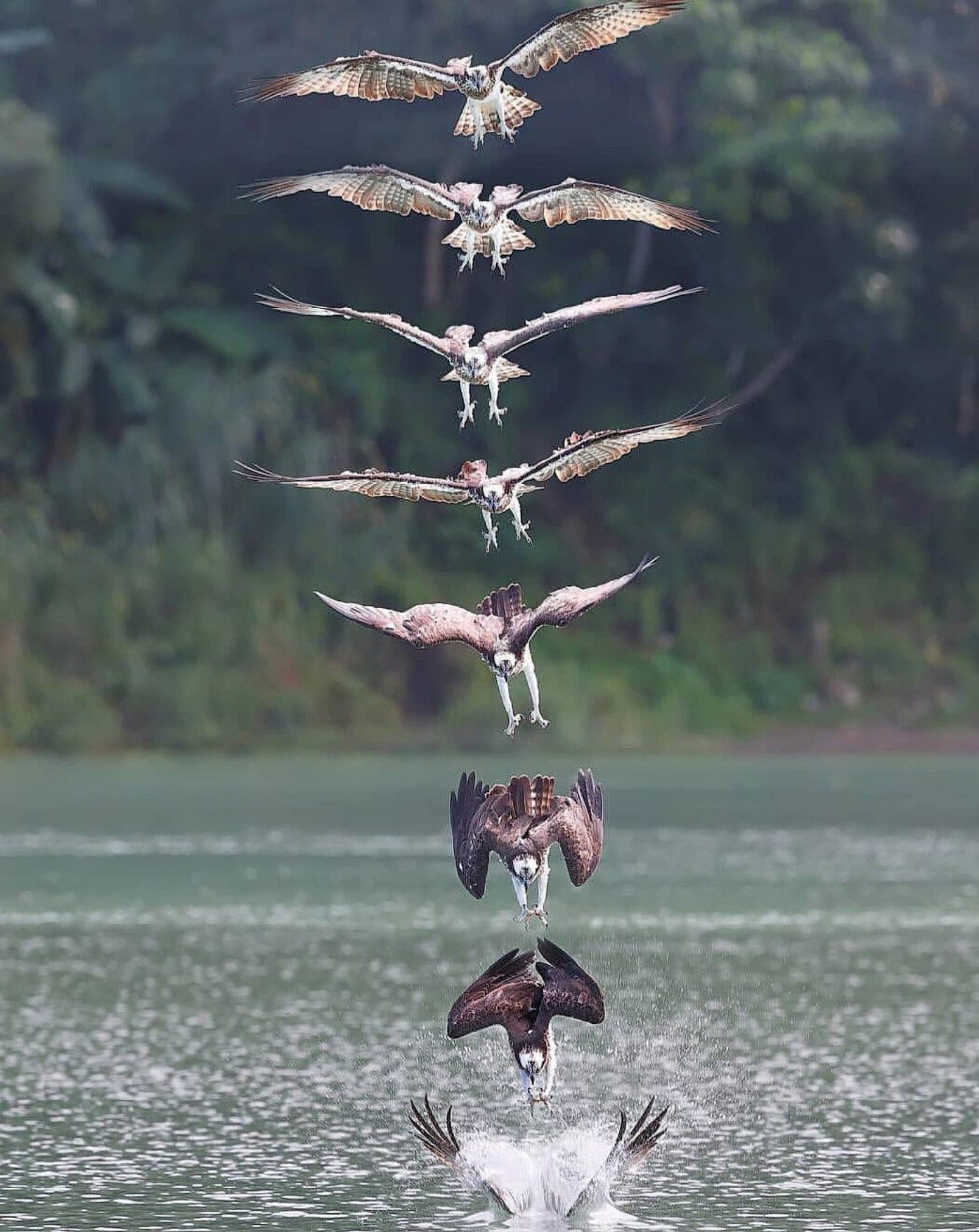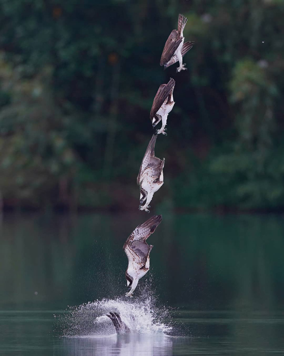 Тайваньский фотограф Chen Chengguang сфотографировал скопу на охоте. Особенно впечатляющими выглядят снимки, где совмещены все движения птицы перед погружением в воду.