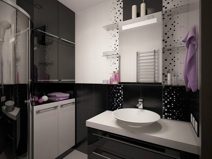 Такие оттенки уместны лишь в том случае, если вы являетесь обладателем квартиры или дома с большим санузлом. В этом случае, вы можете поэкспериментировать и оформить ванную комнату в черных, бордовых, фиолетовых и других тонах, которые входят в категорию темных. А вот в случае с крохотными санузлами такое решение с самого начала будет провальным, ведь подобные цвета уменьшают пространство, «воруя» ценные квадратные метры. Черный низкий потолок вообще способен превратить комнату в узкую неуютную пещеру. Что касается высокого, то можно оформить его в таком цвете, но лишь в том случае, если свет будет равномерно распределяться по всей комнате. Такая же история и со стенами: вы вполне можете себе позволить покрасить их в черный, но лишь в том случае, если ванная комната большая и освещается со всех сторон.
