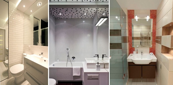По центру комнаты можно повесить люстру, по периметру – организовать подсветку, над зеркалом повесить несколько лампочек, а над ванной расположить бра. Не бойтесь переборщить – если речь идет о ванной, то здесь света много не бывает.