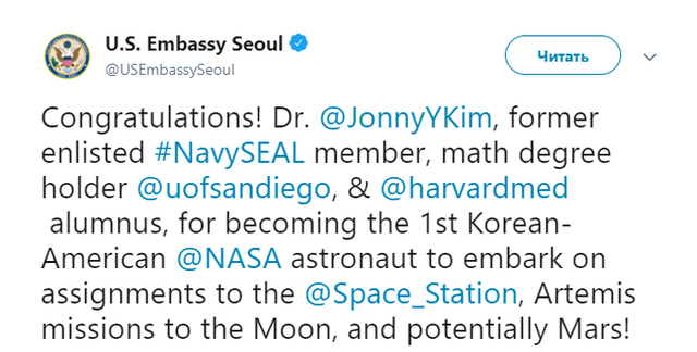 Перевод: Поздравляем! Джонни Ким, бывший «морской котик», выпускник университета Сан-Диего и Медицинской школы Гарварда, стал первым американо-корейским астронавтом NASA, готовым отправиться на МКС, Луну и, возможно, на Марс!