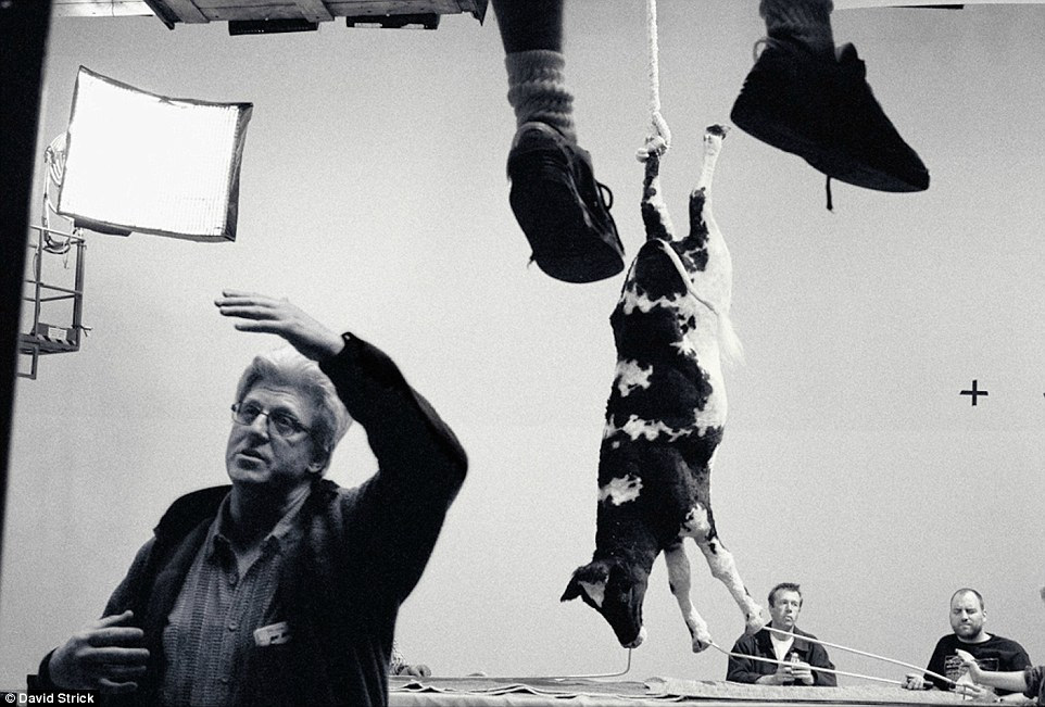 Технический персонал поднимает корову во время съемки приключенческой комедии «Крысиные бега» в 2001 году.