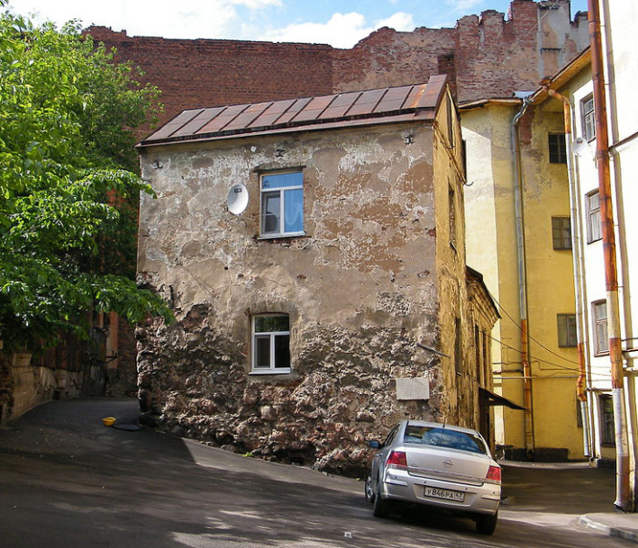 В нашей стране самым старым жилым домом считается маленькое здание, расположенное в центре Выборга. Оно стоит на скале, поэтому все его стороны имеют разную высоту.