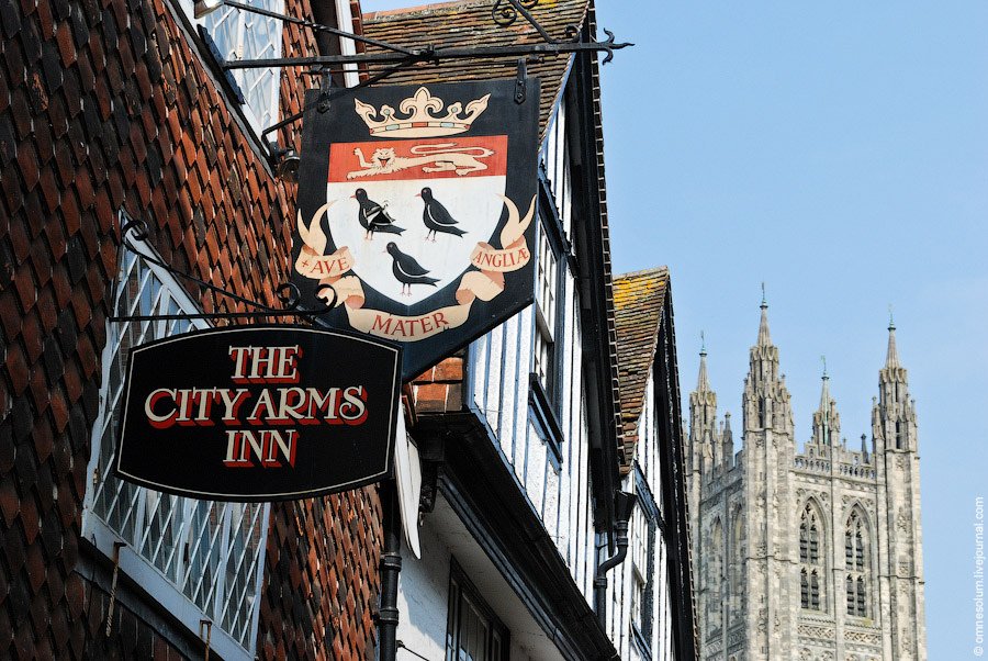 Герб именитой семьи или города нередко создаёт имидж пабу. Такие названия легко отличить по наличию в них слова arms. На фото: The City Arms Inn, Кентербери:
