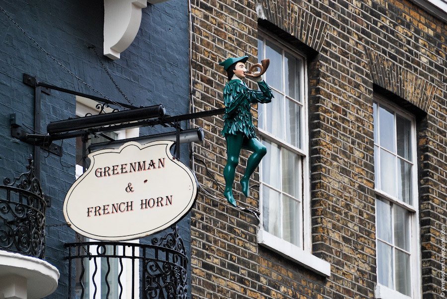 Происхождение некоторых персонажей с вывесок не совсем понятно. Зелёный человек, например — это дух природы, но вот откуда у него валторна? На фото: Greenman & French Horn, Лондон: